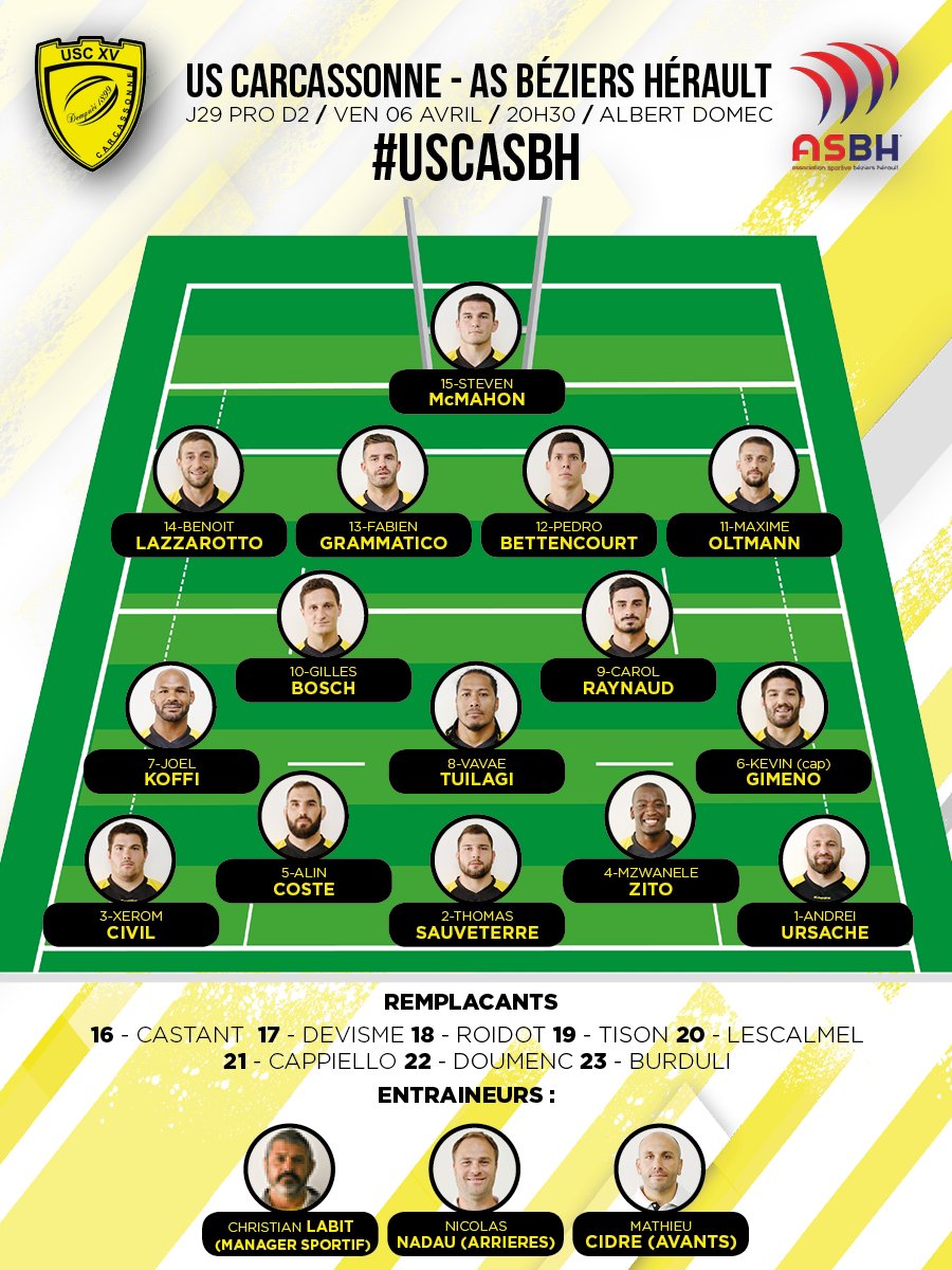 Salut amis de Carcassonne.Bon je sais pas si vous avez vu notre compo mais une très grosse équipe a était aligné avec plusieurs cadre et surtout la rentré de liebenberg dans l'équipe qui va amener un plus dans cette equipe.Je ne comprends pas de votre coter pourquoi vous avez pas aligné lescalmel en 10 et tison en troisième ligne titulaire?
