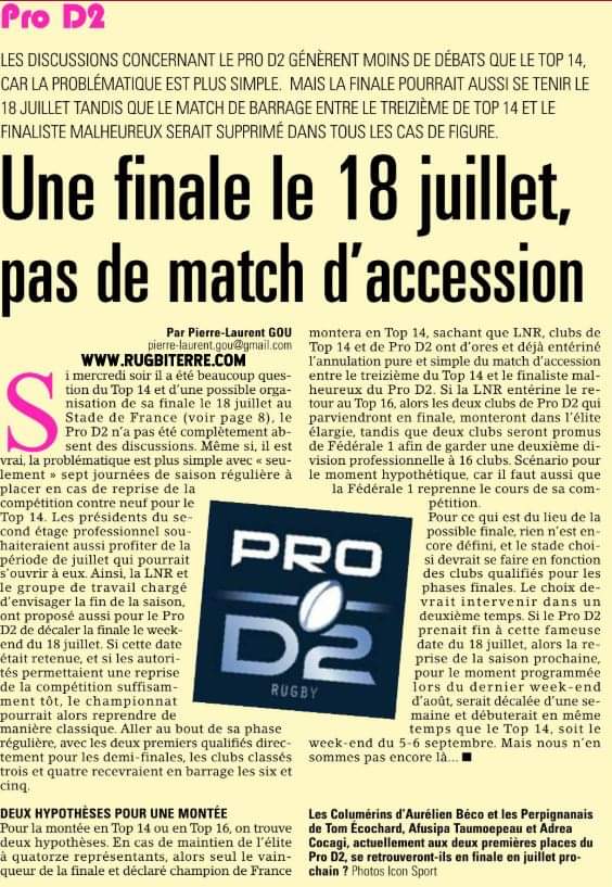 matbouba a écrit : 21 mars 2020, 11:57 Je viens de lire un article concernant le top 14 si reprise il y a ils ont a l'étude un système de poule on il y aurait les 8 premiers qui se disputerait le titre et une autre une poule de relégation avec les 6 derniers.