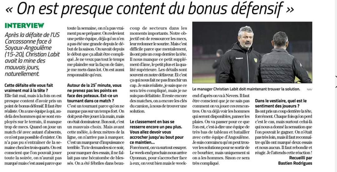 J ai vu 2 entraînements cette semaine, et les 3/4 s entraînaient normalement...seulement tu fais jouer Dulon qui n'est plus avec nous, un arrière qui joue seul l exploit à chaque action, tu enléve ton 9 qui a fait un très bon match à Aurillac, tu fous Marqués qui est plus à la cdm et à Béziers qu à Domec.....Carca11 a écrit : 18 févr. 2023, 08:44 En 1ere mitps tu dois rentrer avec le couteau entre les dents et la bave. Aucune montée défensive, aucune agressivité dans les rucks, aucun ballon pris lancés dans les intervalles. Je veux bien, la pression, des blessés, pas d'entraînement des 3/4 dans la semaine etc etc mais t'as pas mis un timbre de 40 min ! Je ne parle pas de plan de jeu mais d'envie tout simplement