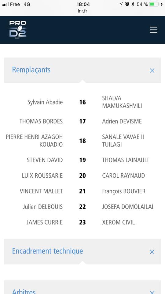 Tuilagi au centre si besoin, je présume !!!Daniel a écrit : 14 déc. 2017, 17:40LA COMPO POUR MASSYPour cette seizième rencontre, l’USC va débuter le match avec l’équipe suivante :