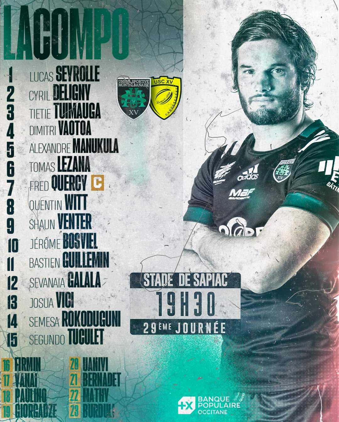 A la lecture de la compo plusieurs interrogations...tout d'abord je croyais que Amrouni et Marques étaient blessés ! Bizarre de revoir à ce moment de la saison, Boyadjis et Plessis Coullaud et pour match importantissime. Par contre, le retour titulaire de Carroll qui est un joueur très physique et avec un Meka dynamique et on espère un Herjean des grands jours nous avons une belle 3ème ligne. Enfin pour Raynaud il a beaucoup joué ces temps ci il a besoin de souffler et nous apportera en seconde mi-temps. Par contre, Beko. va nous manquer de même que Harley ( qui a enchaîné 28 match phénoménal) dont le staff aurait dû gérer son temps.