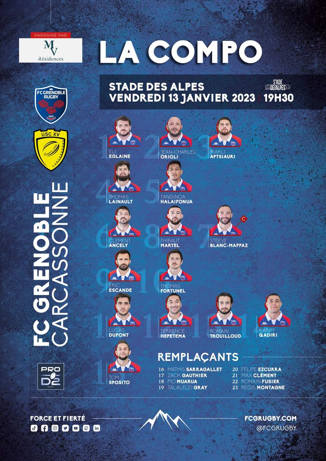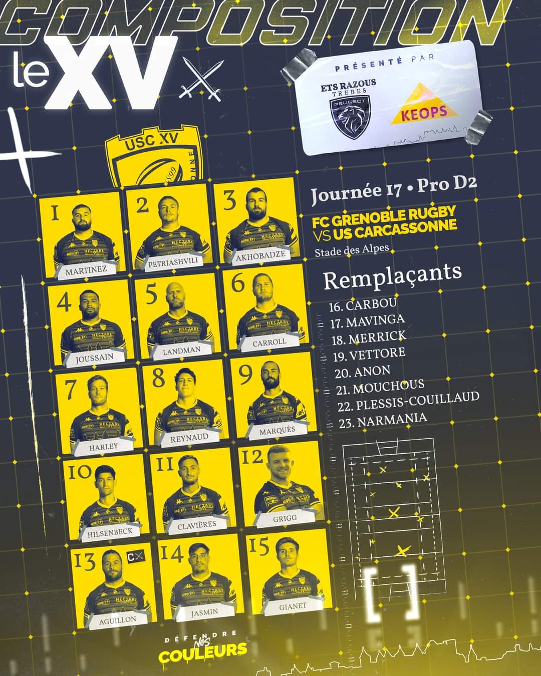Vendredi 13 janvier à 19h30, l’US Carcassonne se déplace dans le cadre de la 17ème journée de ProD2. Malheureusement certains joueurs sont indisponibles pour affronter Grenoble.
