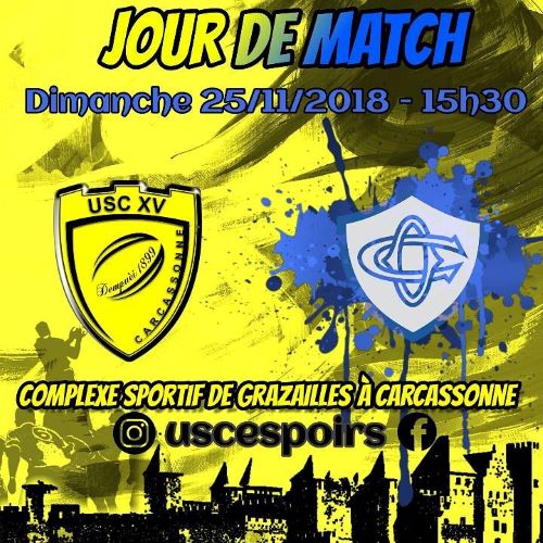 Très bon match de nos jeunes qui font jeu égal en première mi-temps, ne concédant que 3 points sur pénalités à la 40 ème minute, c'est sur le score de 3 à 0 en faveur des locaux que la mi-temps est sifflée. Dès la reprise les jaunes égalisent, les locaux commentant un hors jeu sur la réception du coup d'envoi (3 à 3) Les jaunes prennent alors le match en main et monopolisent la balle, suite à un ballon porté avancant sur une vingtaine de mètres le ballon arrive à Sao qui marque en coin, Sidobre transforme, (3 à 10 à la 43 ème minute) ) deux minutes plus tard (45ème)sur une action similaire Sao récidive et Sidobre transforme à nouveau (3 à 17), l'USC qui domine cette seconde partie passe encore deux pénalités (Lalarme à la 56ème et Sidobre à la 61 ème) 3 à 23 au score. Sentant l'équipe adverse faiblir les jaunes redoublent d'ardeur ce qui permet à Tramon de marquer l'essai du bonus à la 68ème minute , Sidobre transforme (03 à 30) malgré un sursaut des locaux les jaunes gardent cet avantage pour ramener un bonus mérité .