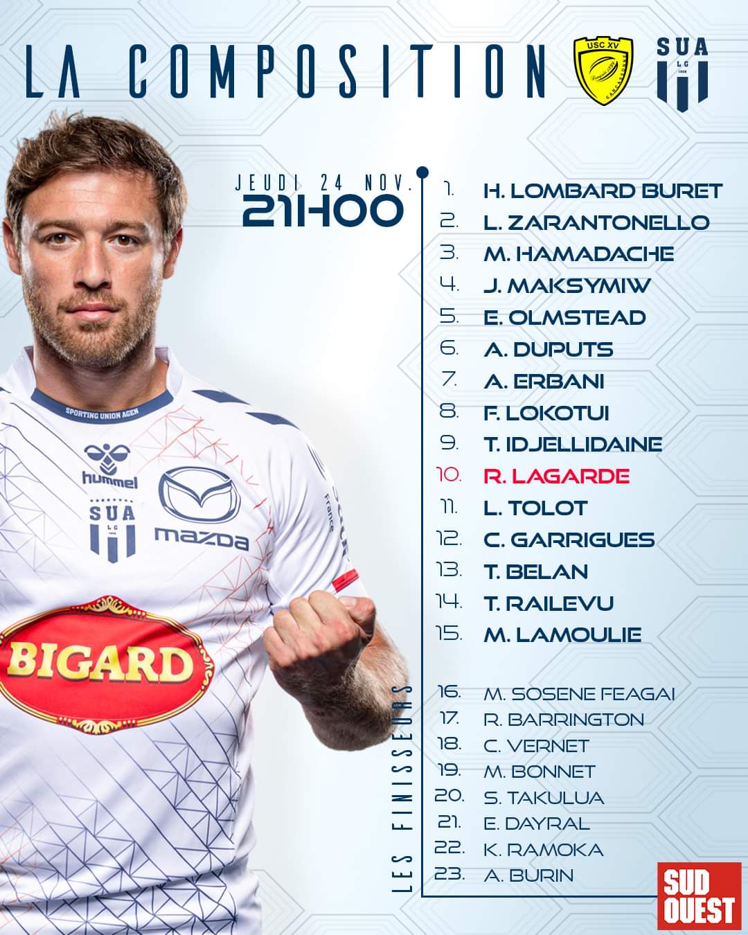 Jeudi 24 novembre à 21h, l’US Carcassonne reçoit Agen dans le cadre de la 12ème journée de Pro D2. Malheureusement certains joueurs sont indisponibles pour affronter les Agenais.